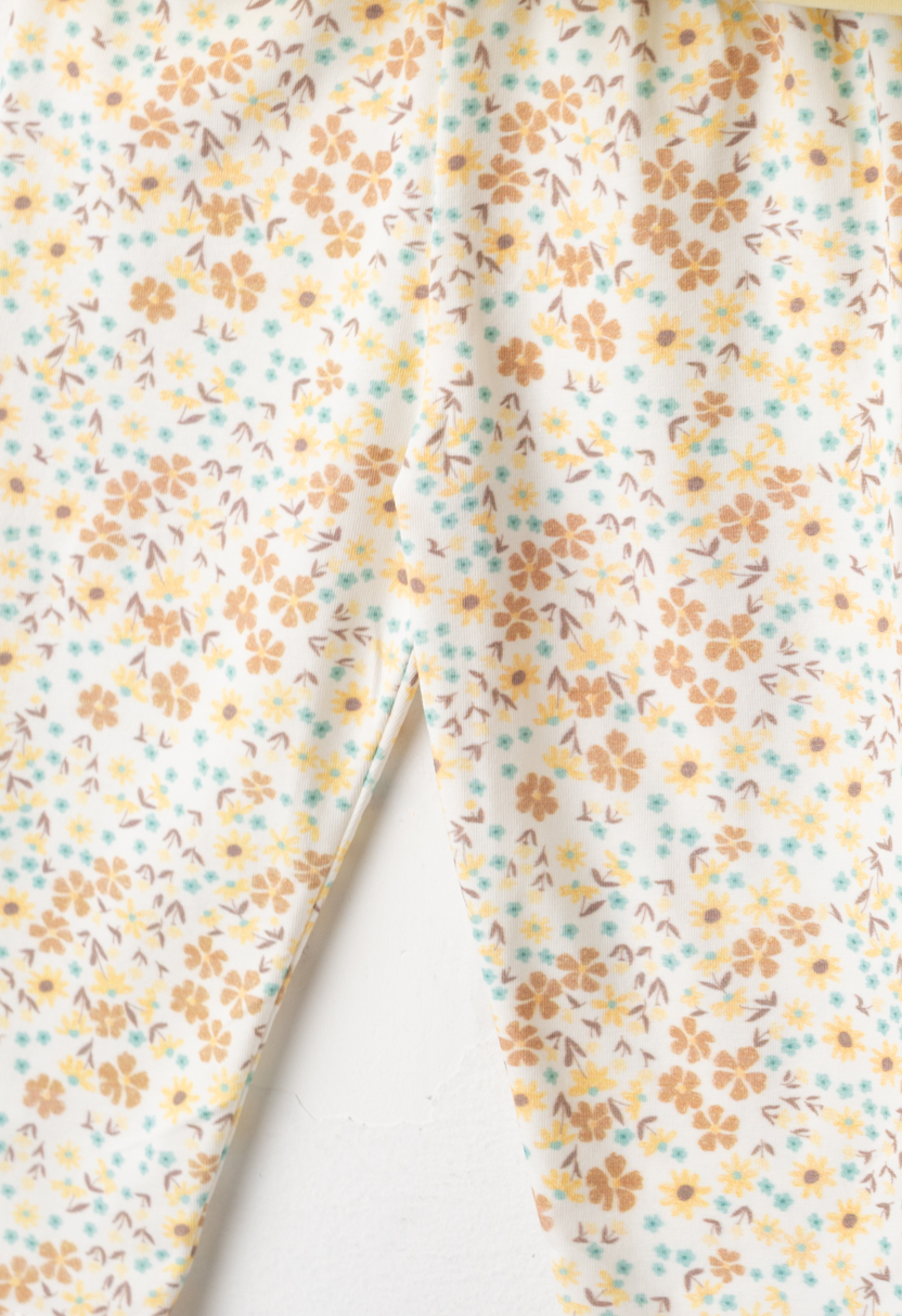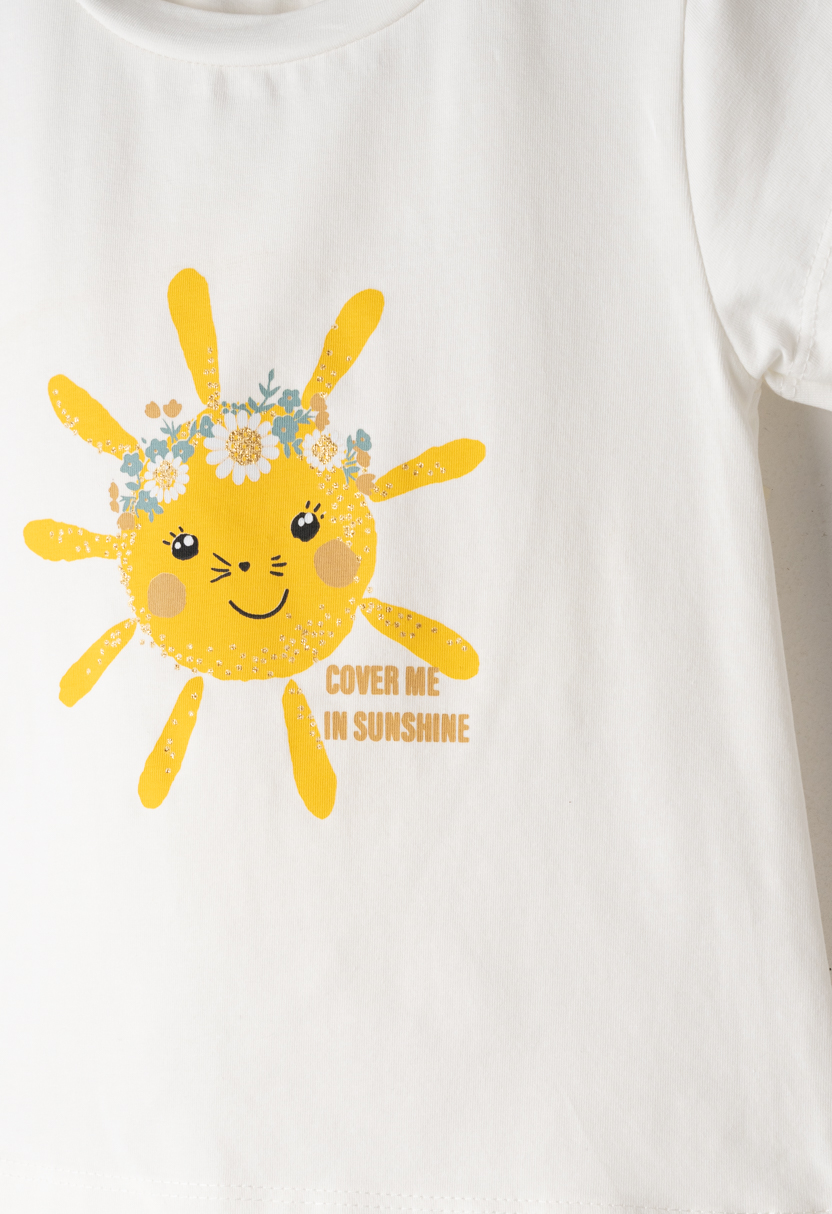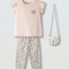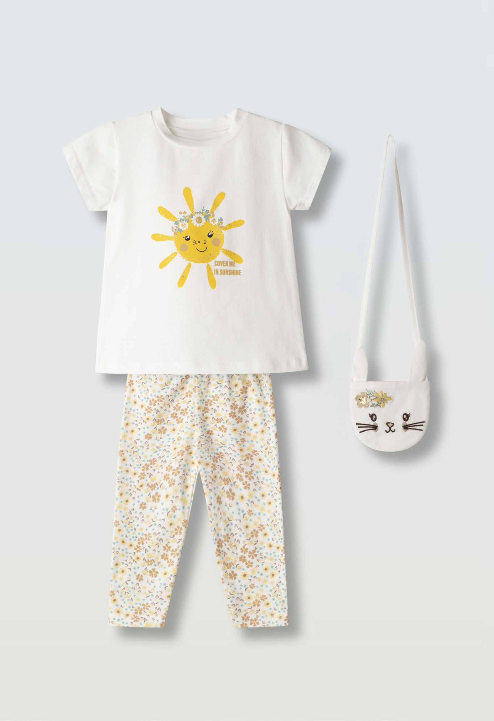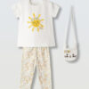 Σετ 3 τεμαχίων. Μπλούζα με στάμπα ήλιο, κάπρι κολάν υφή ριπ και υφασμάτινο τσαντάκι.