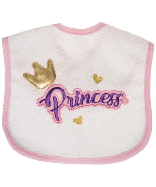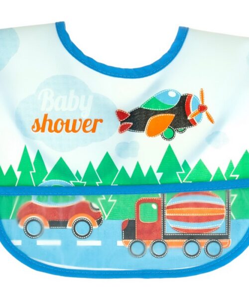 Σαλιάρα με μανίκια και στάμπα στο εμπρός μέρος. Πλαστική επένδυση και άνοιγμα με κορδόνι στο πίσω μέρος.