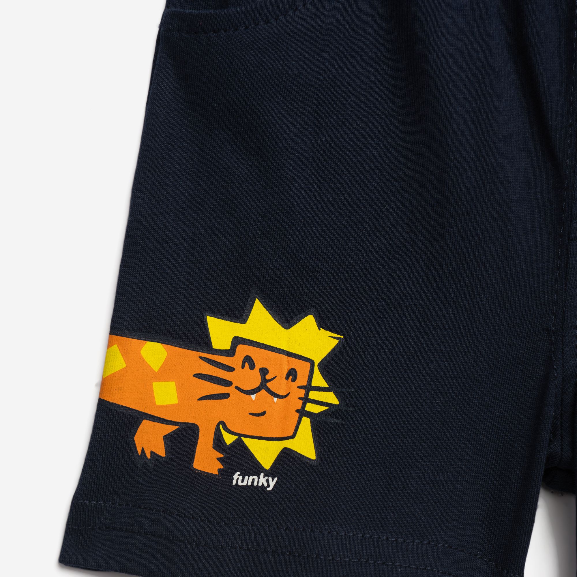 Βρεφικό σετ με στάμπες ζωάκια. Μπλούζα με κουμπάκια στο πίσω μέρος και σορτσάκι με τσέπες.