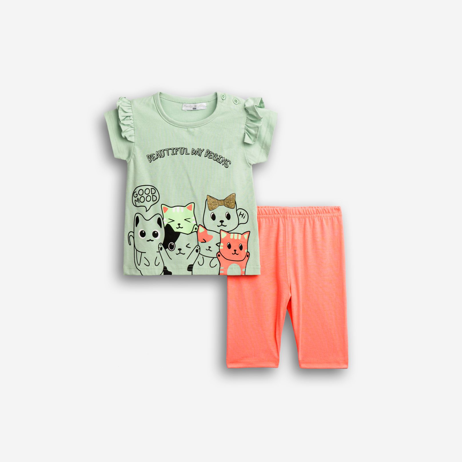 Βρεφικό σετ σε υπέροχο χρωματικό συνδυασμό. Μπλούζα με στάμπα γατάκια, φραμπαλά και κουμπάκια στον ώμο και κολάν κάπρι.
