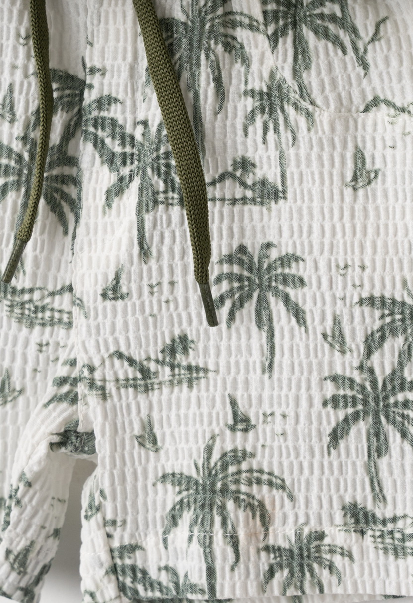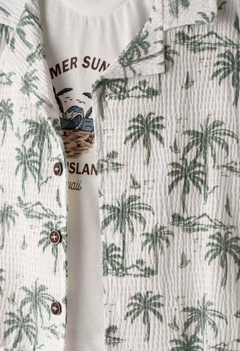 Βρεφικό σετ 3 τμχ. Αποτελείται από βερμούδα και πουκάμισο σε υφή γκοφρέ με σχέδιο φοίνικες και μπλούζα με στάμπα.