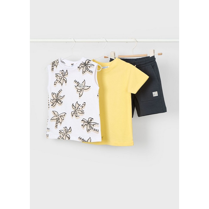 Σετ 3 τεμαχίων που αποτελείται από κοντομάνικο μπλουζάκι, αμάνικο μπλουζάκι και βερμούδα με τσέπες. Σχέδιο φοίνικες.