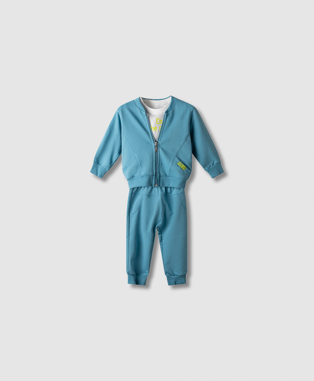 Σετ 3 τεμαχίων λεπτό βαμβακερό. Αποτελείται από ζακέτα με φερμουάρ και τσεπάκια, κοντομάνικο μπλούζάκι με σχέδιο ρίγες και παντελόνι φόρμας.