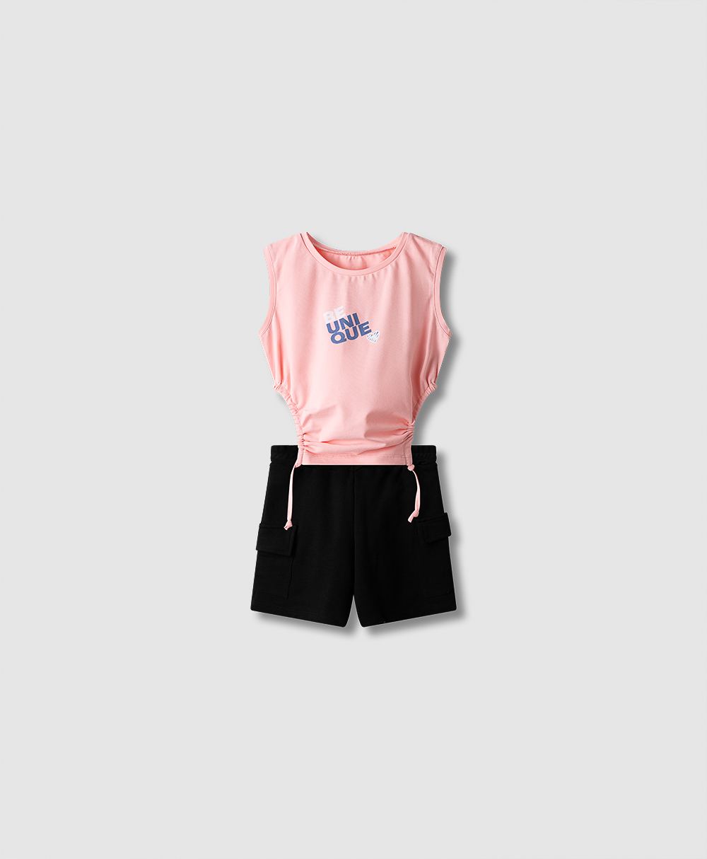 Σετ μπλούζα με ανοίγματα δεξιά και αριστερά στην μέση και κορδόνια στο τελείωμα και σορτς με τσέπες cargo.