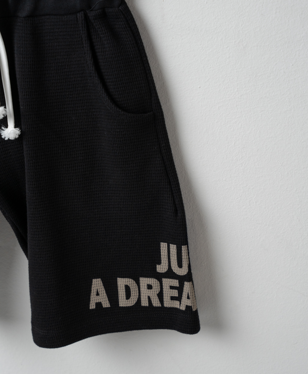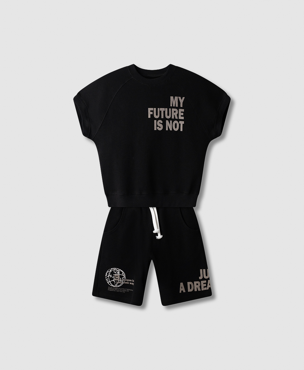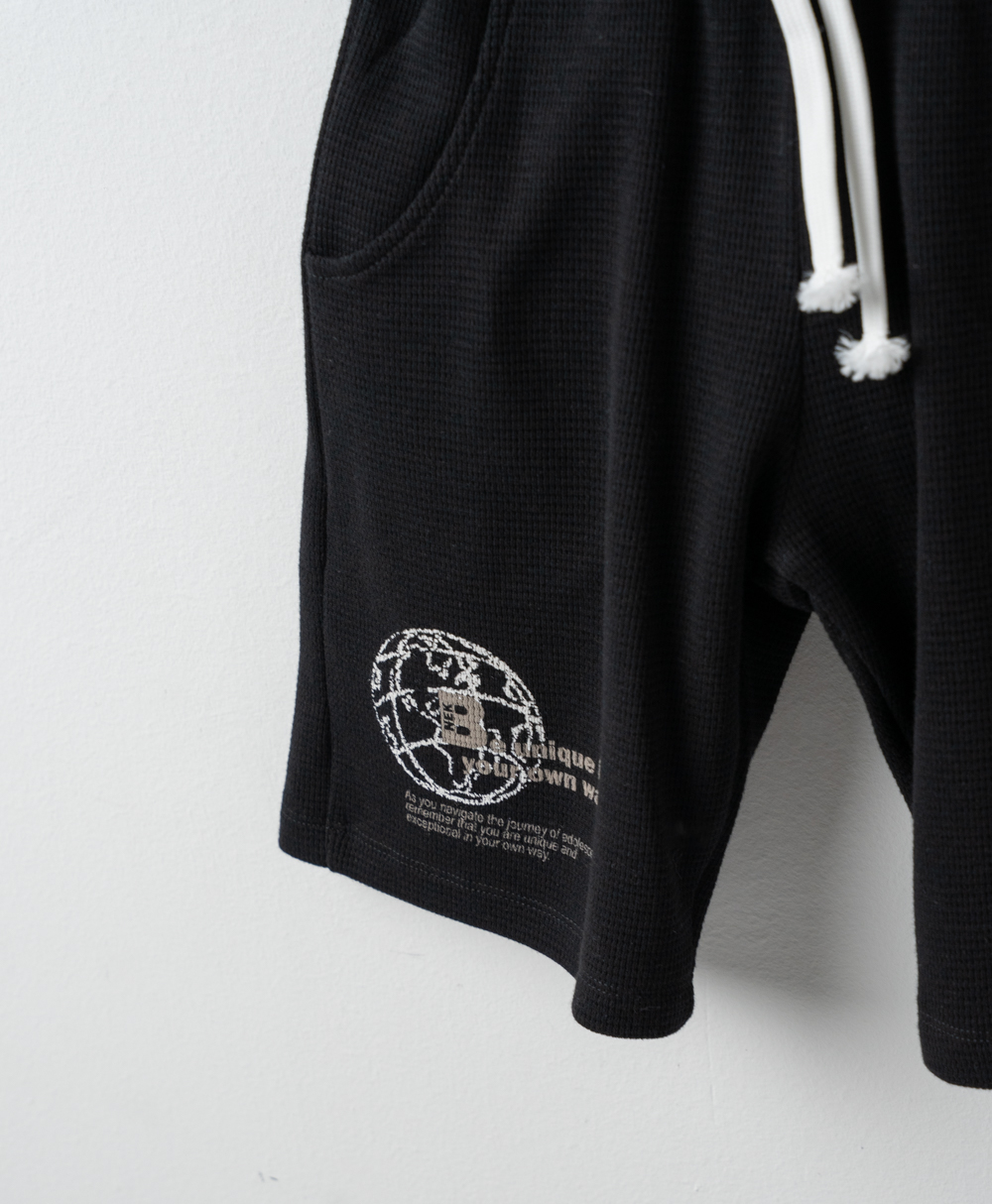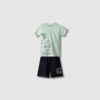 Σετ πικέ με ανάγλυφη υφή, ελαστικό με στάμπα. Μπλούζα και βερμούδα με τσέπες και λάστιχο στην μέση.