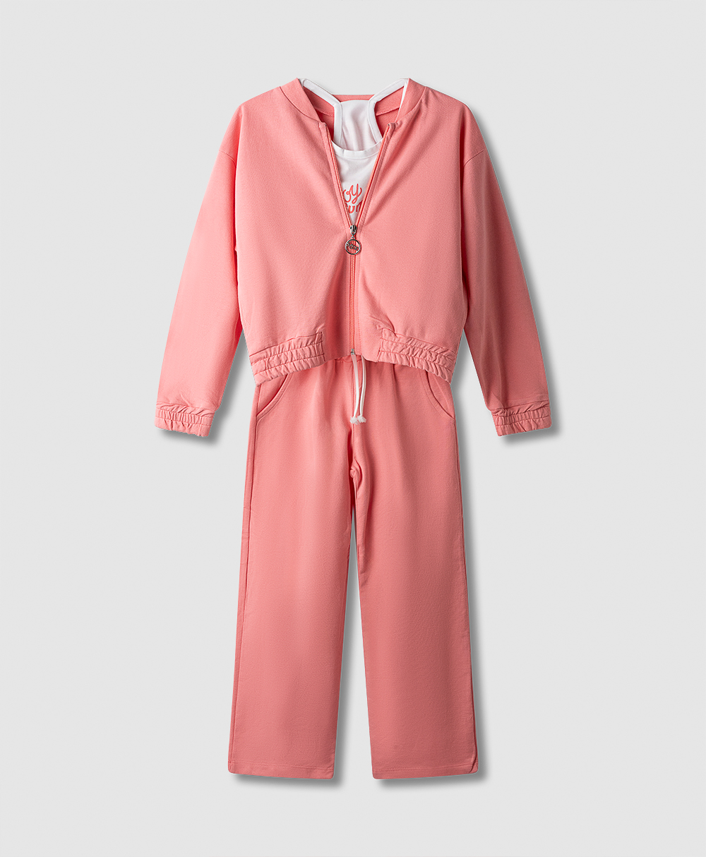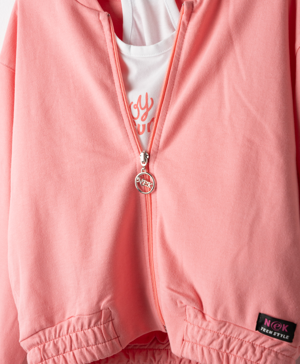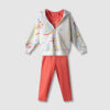 Σετ φόρμας ανοιξιάτικη. Μπλούζάκι αμάνικομε στάμπα, ζακέτα με λάστιχο στο τελείωμα και παντελόνι φόρμας με τσέπες.