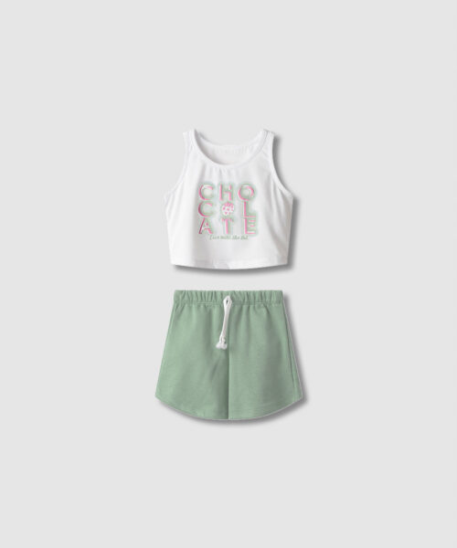 Σετ μπλούζα σε άνετη γραμμή με στάμπα και σορτς με λάστιχο και διακοσμητικό κορδόνι.