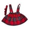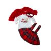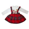 Βρεφικό χριστουγεννιάτικο σετ 4 τεμαχίων. Αποτελείται από φόρεμα καρώ με τιράντες και φιόγκο, μπλούζα με σχέδιο, πανωφόρι με υφή γούνας και κορδέλα.