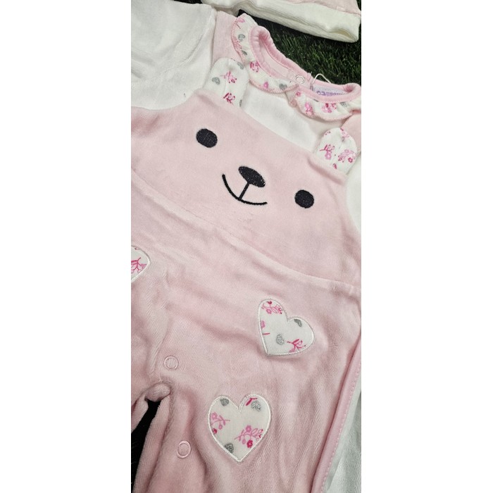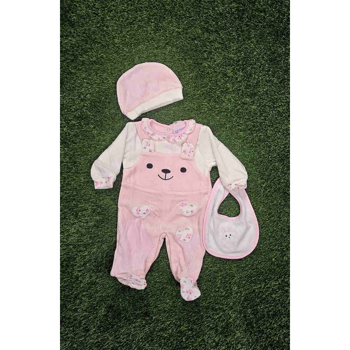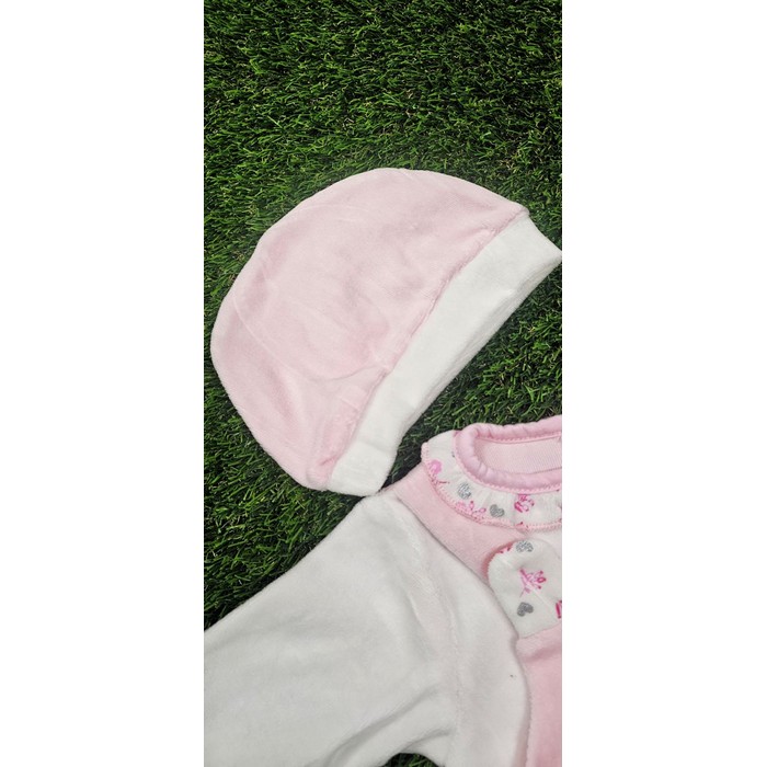 Βρεφικό φορμάκι ολόσωμο βελουτέ σχέδιο κουνελάκι και καρδούλες, με σαλιάρα και σκουφάκι.